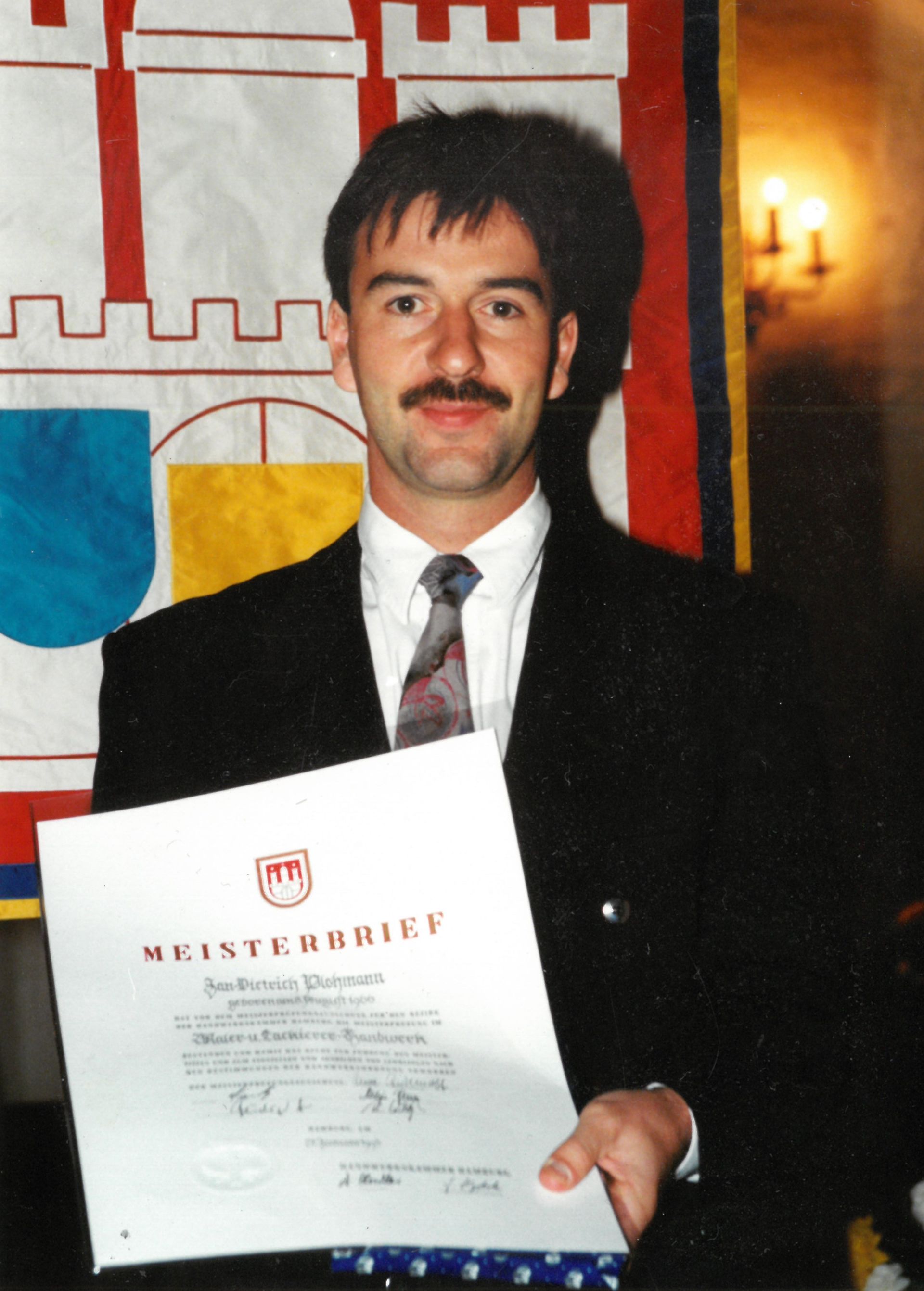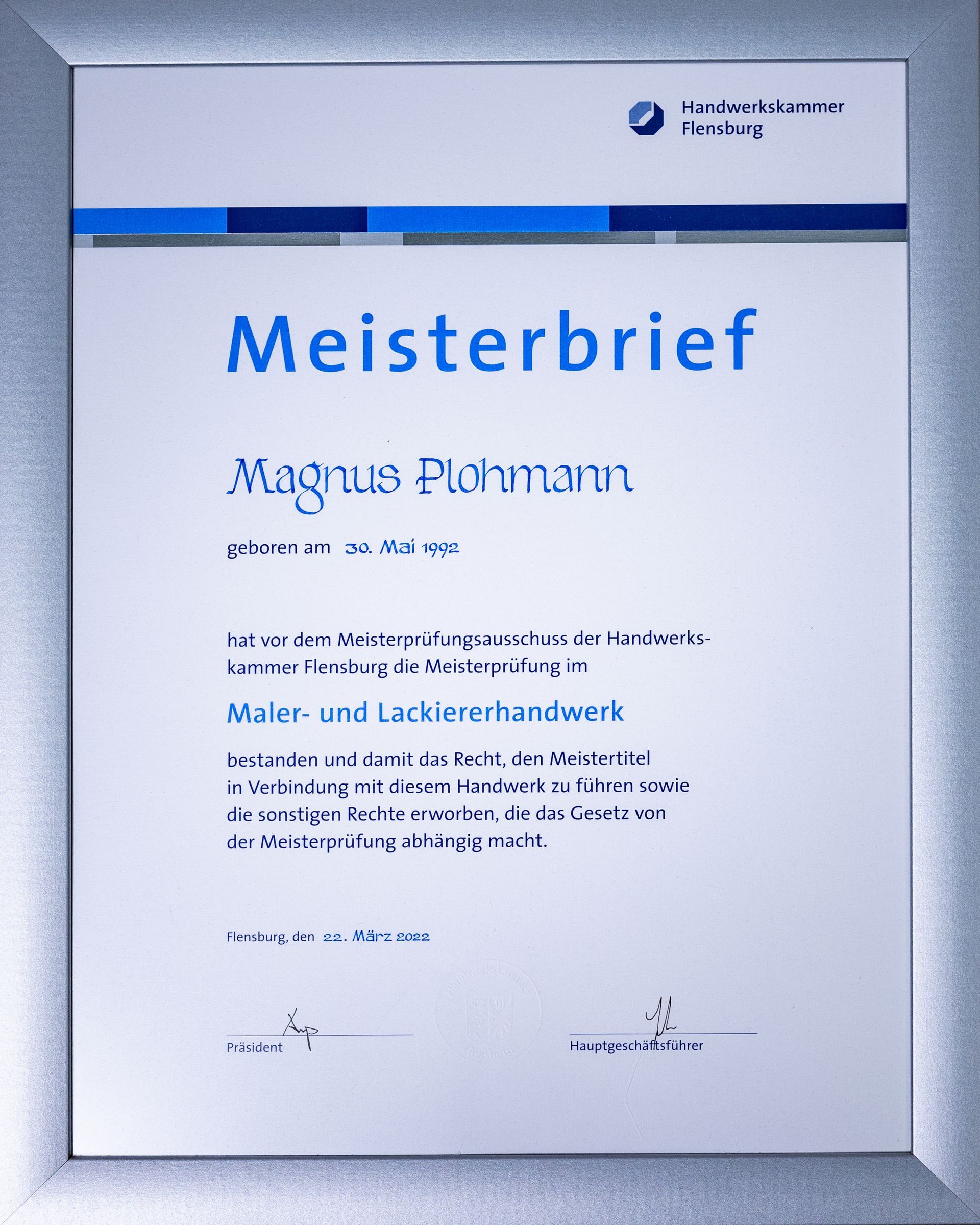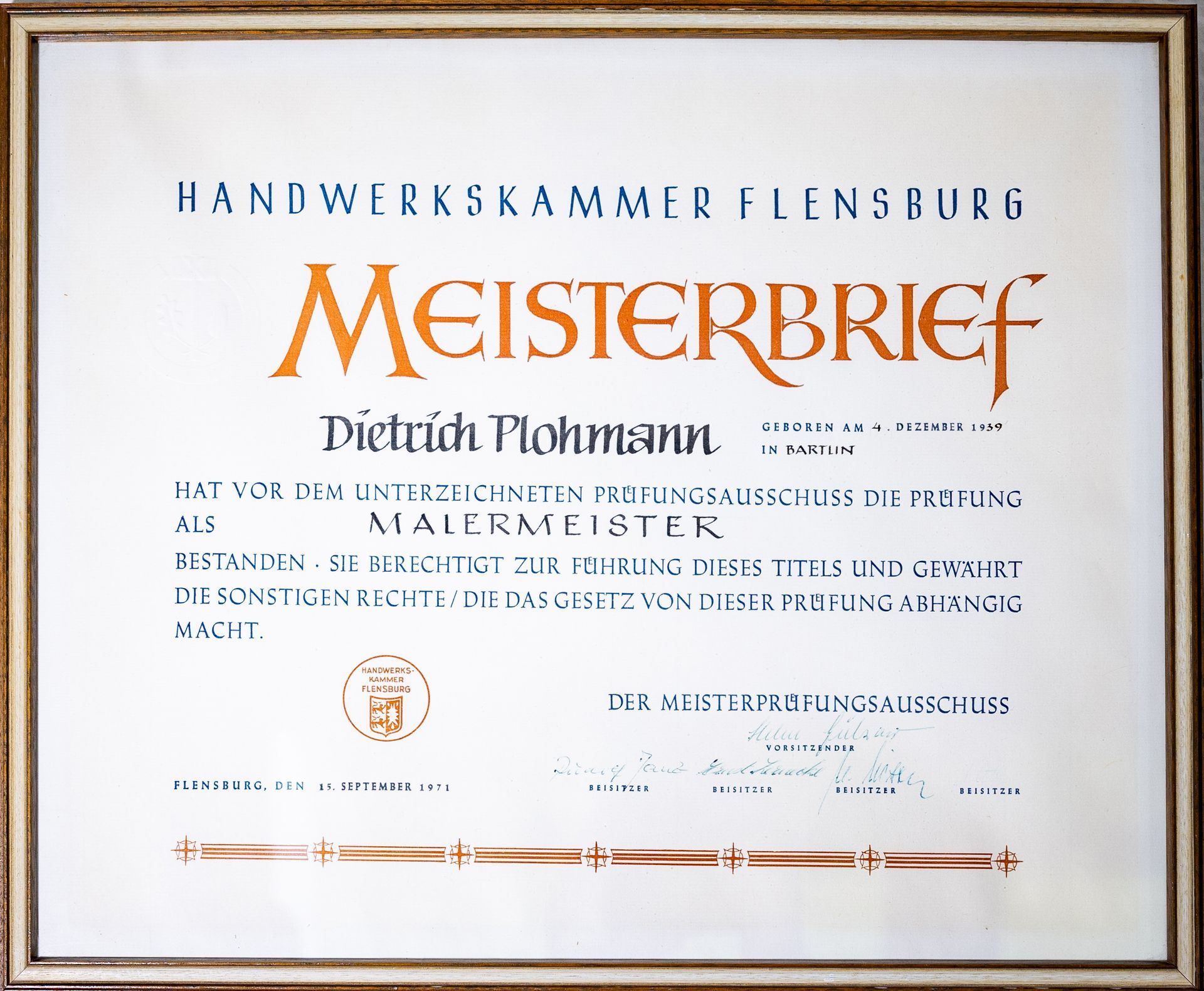 1984 begann der heutige Seniorchef, Jan Plohmann, seine Ausbildung zum Maler- und Lackierergesellen, die er 1987 erfolgreich abschloss. Nach Jahren der Praxiserfahrung in Rendsburg und Düsseldorf erwarb er 1992 seinen Meistertitel an der Fachschule Farbe in Hamburg. Seitdem leitet er das Unternehmen gemeinsam mit den anderen Meistern.