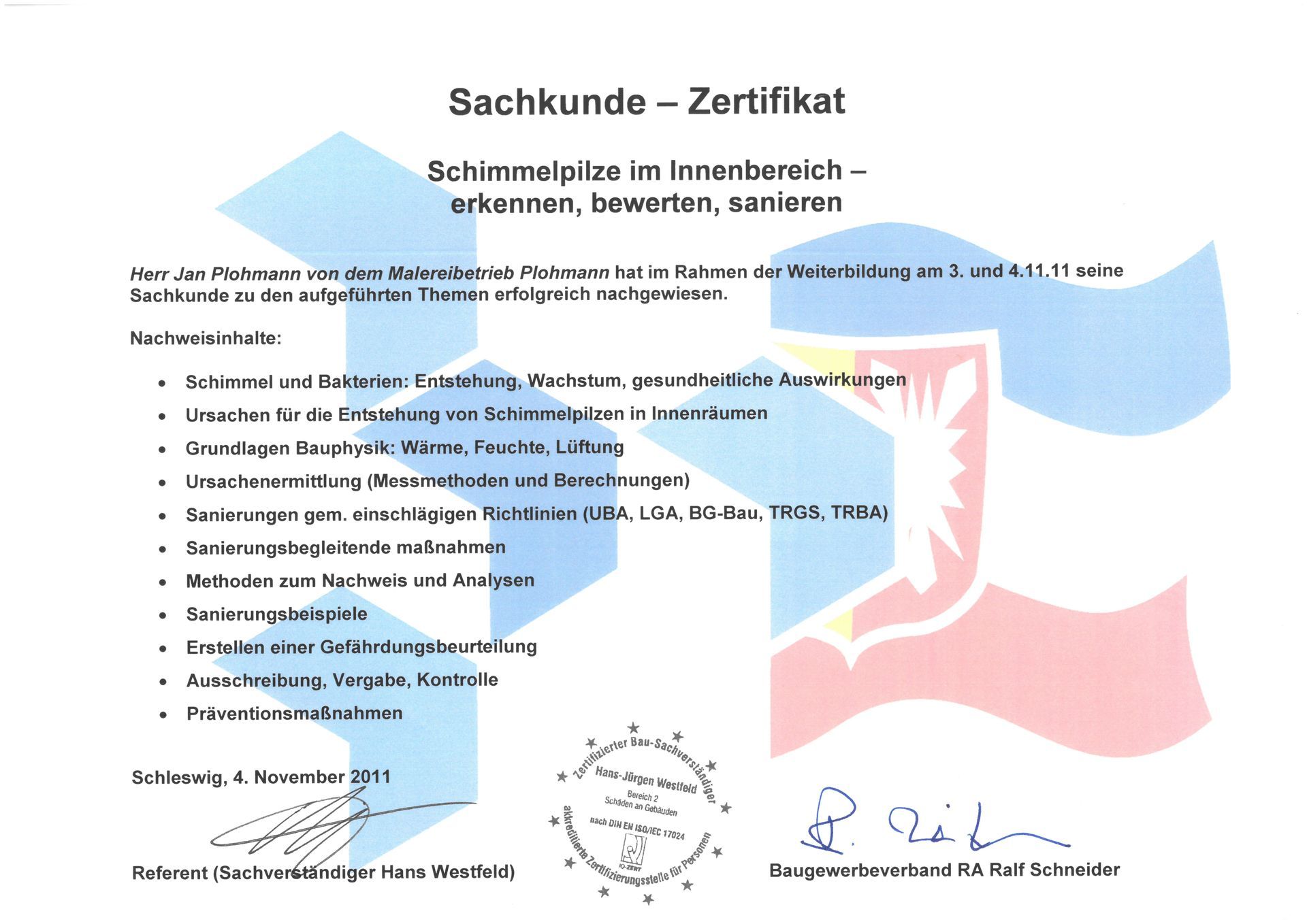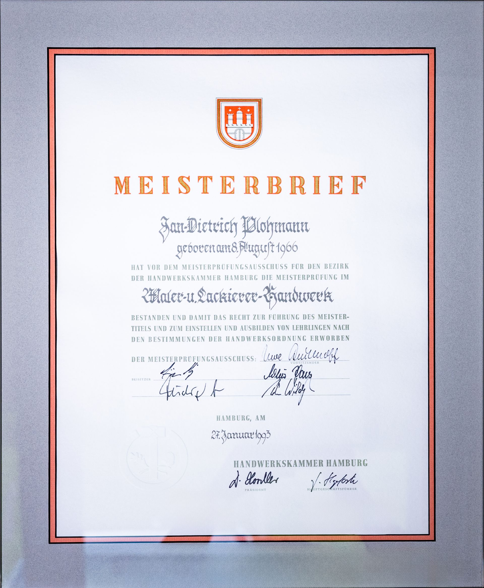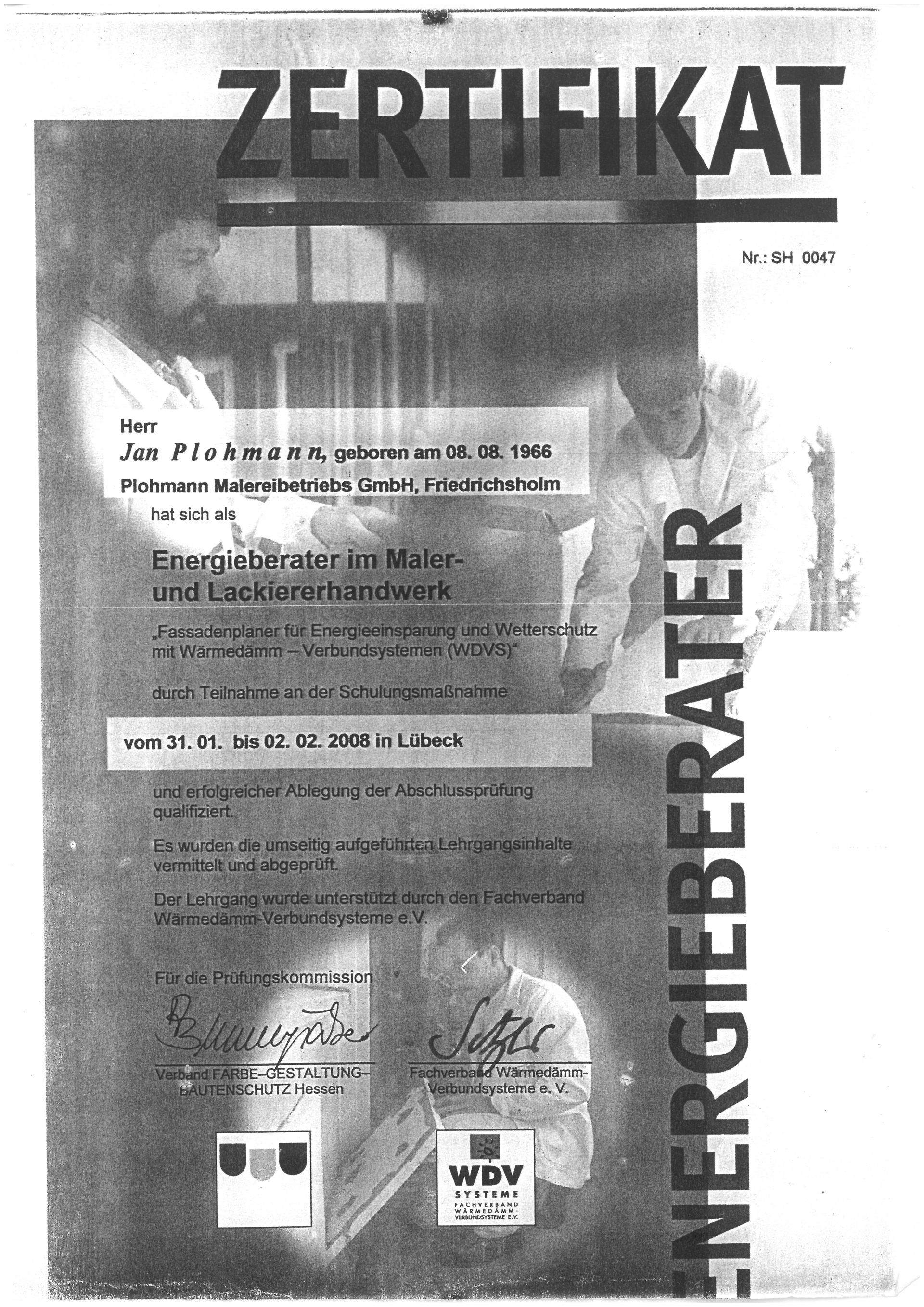 1984 begann der heutige Seniorchef, Jan Plohmann, seine Ausbildung zum Maler- und Lackierergesellen, die er 1987 erfolgreich abschloss. Nach Jahren der Praxiserfahrung in Rendsburg und Düsseldorf erwarb er 1992 seinen Meistertitel an der Fachschule Farbe in Hamburg. Seitdem leitet er das Unternehmen gemeinsam mit den anderen Meistern.